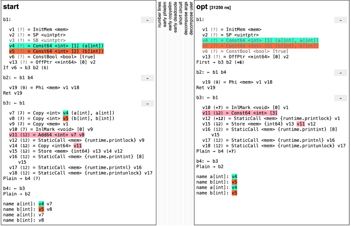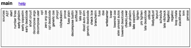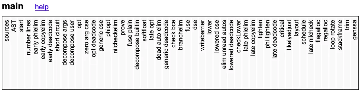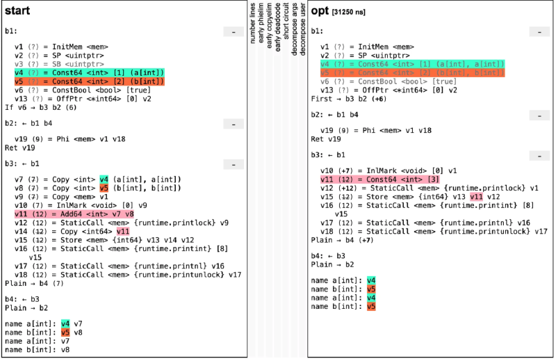 GOSSAFUNC=main go tool compile main.go && open ssa.html我们可以用上面命令打印出SSA,并展现在HTML,下面截几个示例图,有兴趣查看全部内容的读者可以执行上面的命令在浏览器查看。