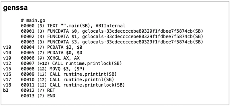 Go 语言的中间代码表示形式为 SSA(Static Single-Assignment,静态单赋值),之所以称之为单赋值,是因为每个名字在 SSA 中仅被赋值一次。