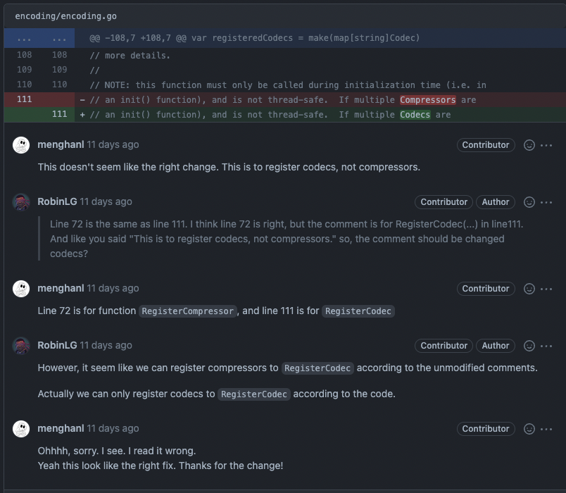 所以对于grpc-go的encoding这个包,grpc-go本身并没有自己实现编码/解码,压缩/解压缩的代码,而是调用其他包。所以这个包也没什么代码值得去分析。不过值得一提的是笔者在看这个包的注释时候发现了一个错误,后来提了PR,reviewer当时跟我争辩了几句(他认为没有错)。然而,最终我的PR还是被合并啦!