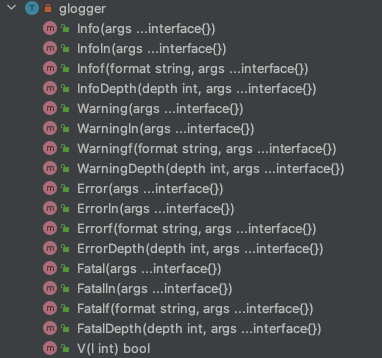从下边的图可以看出glogger结构体实现了上边LoggerV2接口的所有方法,那么我们可以说glogger结构体实现了LoggerV2接口,而无需像Java一样在类后面显示地用implements声明。