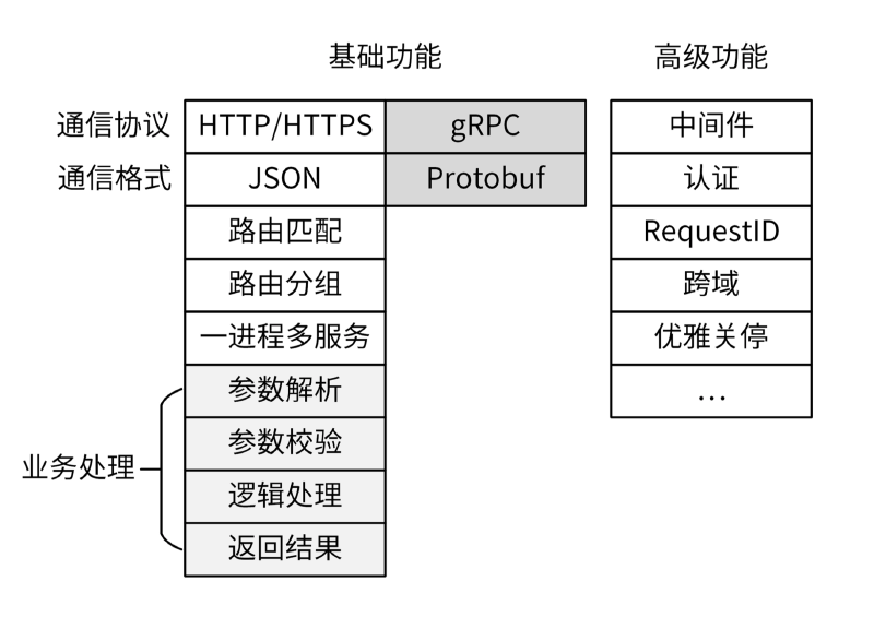我们开发Web服务最核心的诉求是:输入一些参数,校验通过后,进行业务逻辑处理,然后返回结果。所以Web服务还应该能够进行参数解析、参数校验、逻辑处理、返回结果。这些都是Web服务的业务处理功能。