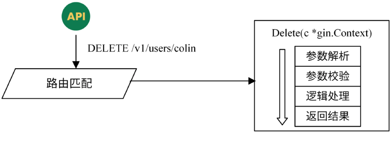 一次HTTP请求经过路由匹配,最终将请求交由Delete(c *gin.Context)函数来处理。变量c中存放了这次请求的参数,在Delete函数中,我们可以进行参数解析、参数校验、逻辑处理,最终返回结果。