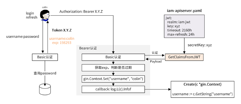 用户要访问iam-apiserver,首先需要通过Basic认证,认证通过之后,会返回JWT Token和JWT Token的过期时间。前端将Token缓存在LocalStorage或Cookie中,后续的请求都通过Token来认证。