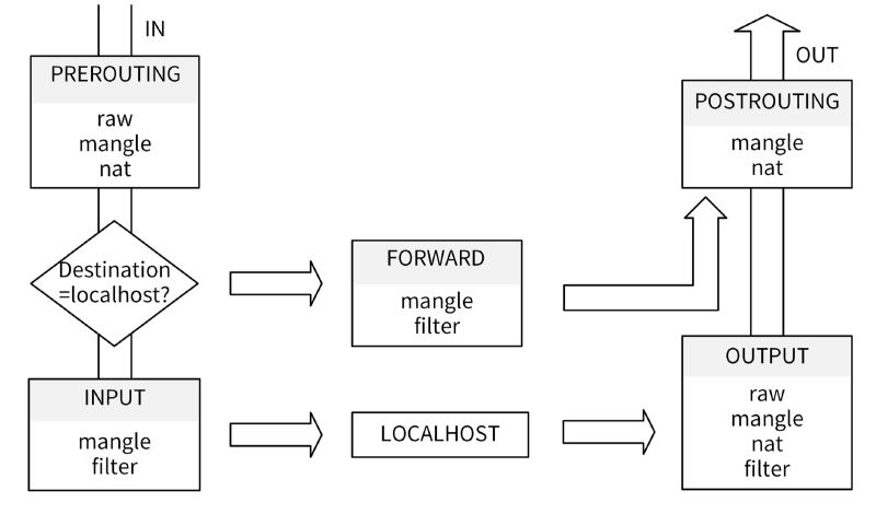 第二步分为两种情况:如果数据包目的地是本机,它会到达INPUT链。到达后,任何进程都会收到它。本机上的程序可以发送数据包,这些数据包会经过OUTPUT链,然后经POSTROUTING链输出;如果数据包是要转发出去,并且内核允许转发,那么数据包会经过FORWARD链,最后从POSTROUTING链输出。