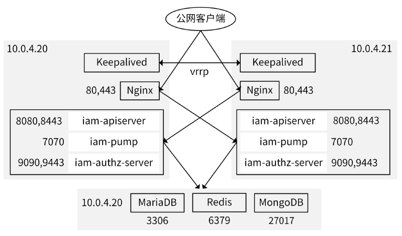 iam-apiserver、iam-authz-server、MariaDB、Redis和MongoDB这些服务,都提供了绑定监听网卡的功能。我们可以将这些服务绑定到内网网卡上,从而只接收来自于内网的请求,通过这种方式,可以加固我们的系统。