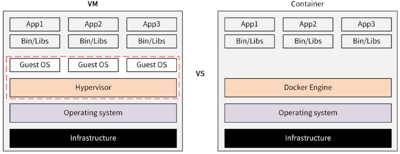 我这里拿Docker和虚拟机来做个对比,让你感受下Docker的强大。二者的架构对比如下图所示: