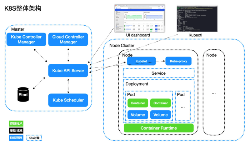 上面那张架构图里的Service、Deployment、Pod等,都不算是组件,而是属于Kubernetes资源对象,我们稍后再做介绍。这里我先简单介绍下架构图的UI dashboard和 kubectl。