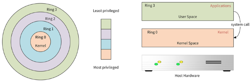 保护模式是通过Ring来实现的。在x86架构上,一共有4个Ring,不同的Ring有不同的权限级别:Ring 0有最高的权限,可以操作所有的系统资源,Ring 3的权限级别最低。Kernel运行在Ring 0上,Application运行在Ring 3上。Ring 3的Application如果想请求系统资源,需要通过system call调用Ring 0的内核功能,来申请系统资源。