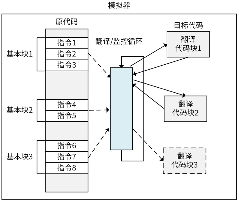由于解释执行性能损失很大,再加上虚拟机中模拟的虚拟CPU和物理CPU的体系结构相同(同质),这样大多数指令可以直接在物理CPU上运行。因此,CPU虚拟化过程中,可以采用更优化的模拟技术来弥补虚拟化漏洞。