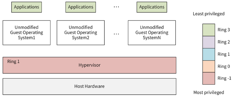 在2006年,Intel和AMD分别在硬件层面支持了虚拟化,比如Intel的VT-X技术和AMD的SVM。它们的核心思想都是引入新运行模式,可以理解为增加了一个新的CPU Ring -1,权限比Ring 0 还高,使VMM运行在Ring -1下,客户机内核运行在Ring 0下。