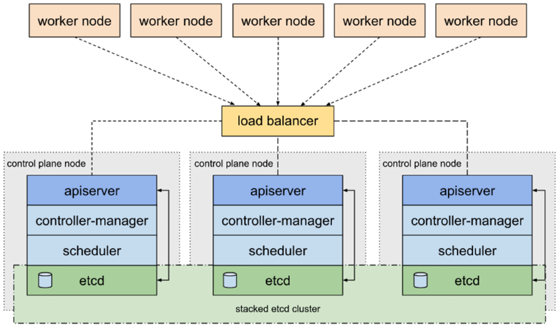 上面图片展示的方案中,所有管理节点都部署了kube-apiserver、kube-controller-manager、kube-scheduler、etcd等组件。kube-apiserver均与本地的etcd进行通信,etcd在三个节点间同步数据;而kube-controller-manager、kube-scheduler和cloud-controller-manager,也只与本地的kube-apiserver进行通信,或者通过负载均衡访问。