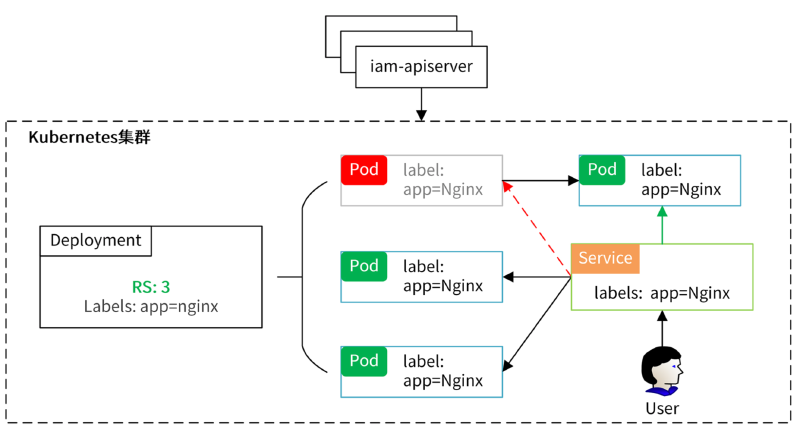 由Deployment创建的ReplicaSet,这时候也会发现有一个Pod故障,健康的Pod实例数变为2,这时候跟其期望的值3不匹配,就会自动创建一个新的健康Pod,替换掉故障的Pod。因为新Pod满足Service的Label Selector,所以新Pod的endpoint会被Kubernetes自动添加到Service对应的endpoint列表中。