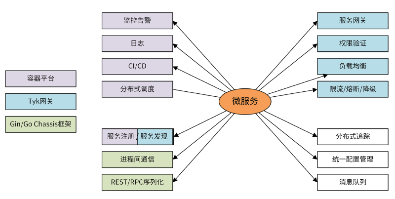服务网关、权限验证、负载均衡、限流/熔断/降级,可以由网关来实现,例如Tyk网关。