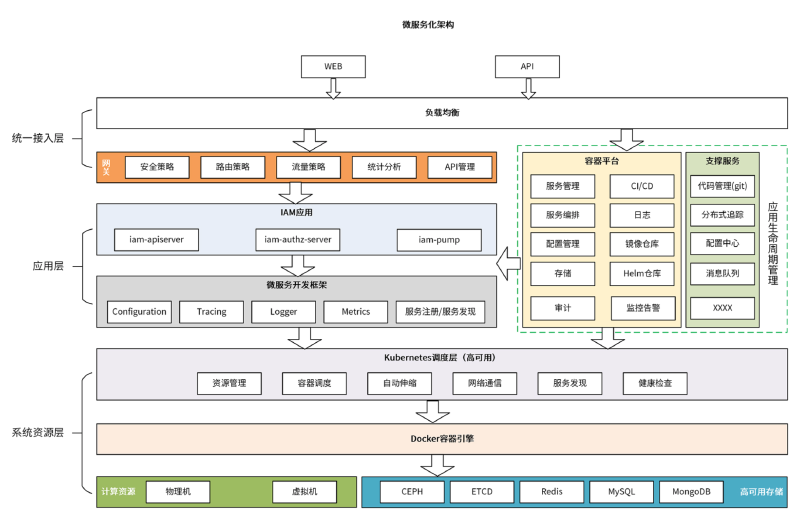 在最下面的系统资源层,我们除了提供传统的计算资源(物理机、虚拟机)之外,还可以提供容器化的计算资源和高可用的存储服务。其中,容器化的计算资源是基于传统的物理机/虚拟机来构建的。