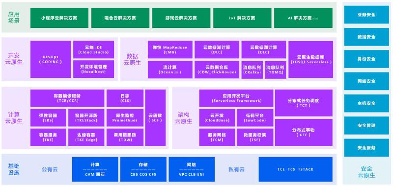 为了补全云原生架构设计版图,这里我也介绍一个公用云版的云原生架构设计。那么,公有云厂商会提供哪些云原生基础设施呢?这里我介绍下腾讯云提供的云原生解决方案。解决方案全景如下图所示: