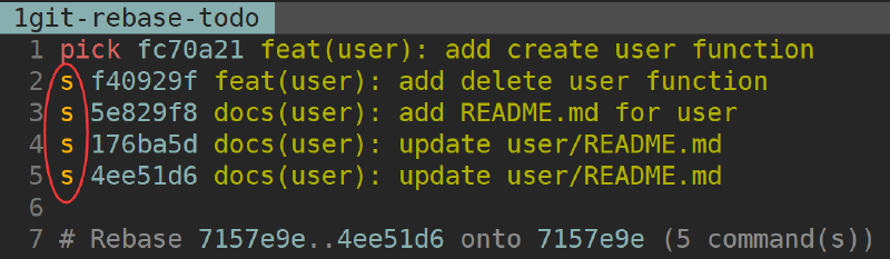 git rebase -i <commid ID>这里的 commit ID 一定要是需要合并 commit 中最旧 commit 的父 commit ID。- 我们希望将 feature/user 分支的 5 个 commit 合并到一个 commit,在 git rebase 时,需要保证其中最新的一个 commit 是 pick 状态,这样我们才可以将其他 4 个 commit 合并进去。