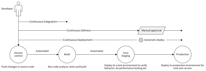 - 持续交付和持续部署。二者都是持续地部署应用,但是持续部署整个过程是自动化的,而持续交付中,应用在发布到现网前需要人工审批是否允许发布。