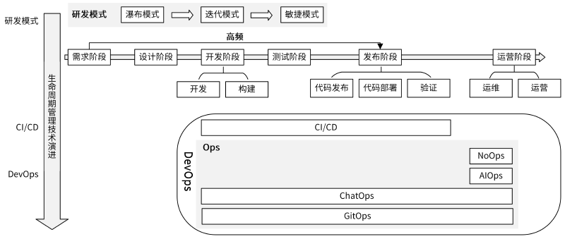 应用生命周期管理最开始是通过研发模式来管理的。在研发模式中,我按时间线分别介绍了瀑布模式、迭代模式和敏捷模式,其中的敏捷模式适应了互联网时代对应用快速迭代的诉求,所以用得越来越多。