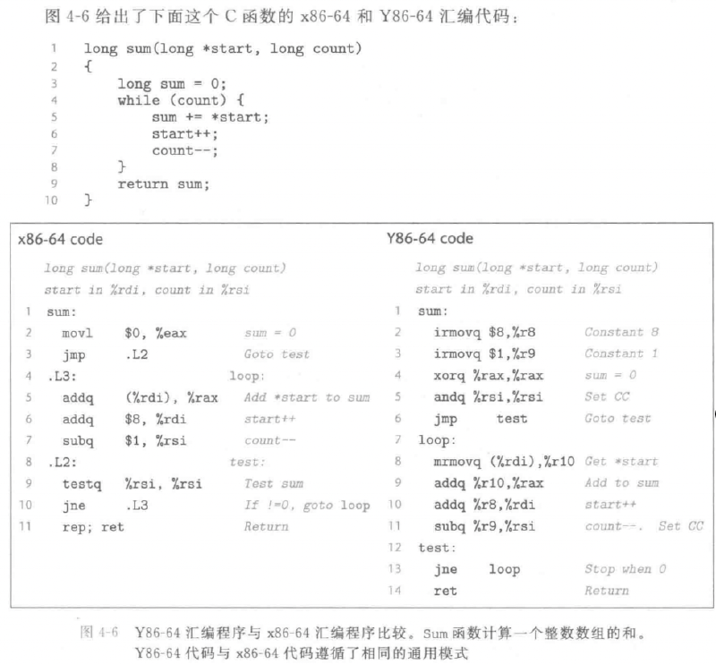 如果我们用Y86-64的编译器生成汇编代码,那么汇编代码里的指令集就会是上图那些。例如由GCC编译器产生的汇编代码,汇编代码里的指令就属于x86-64指令集。