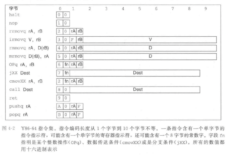下图举例了Y86-64中定义的一些指令,简单来说就是对寄存器、内存中的数据进行操作。