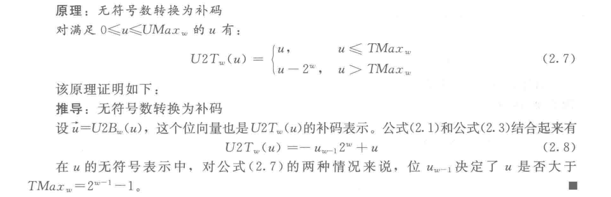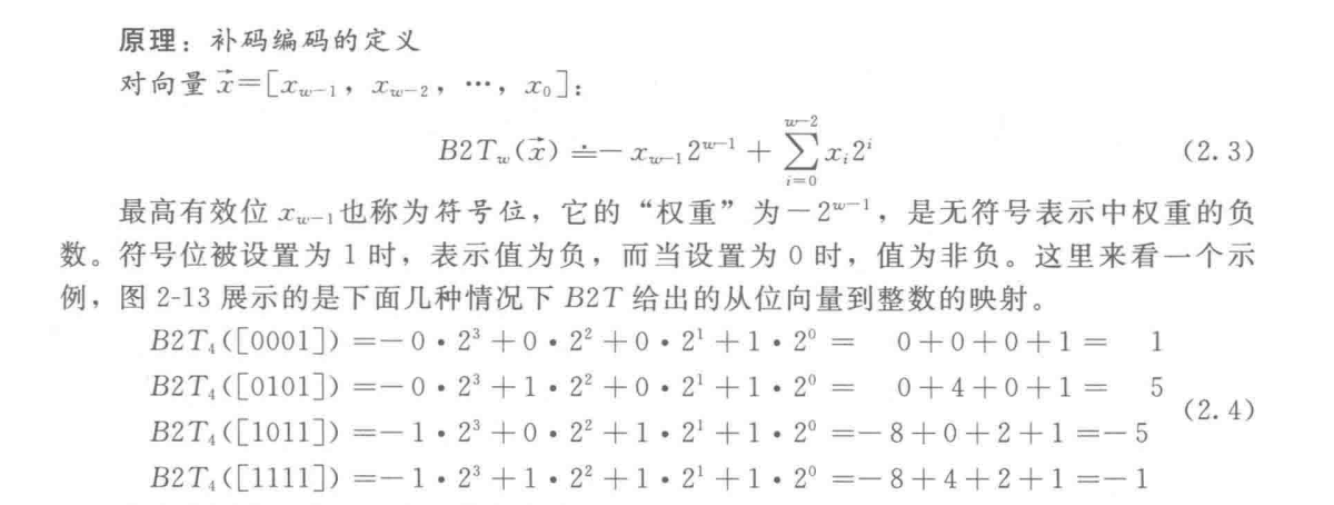 C语言标准并没有要求要用补码形式来表示有符号整数,但是几乎所有的机器都是这么做的。在补码(two’s -complement )的定义中,将字的最高有效位解释为负权(negative-weight)。